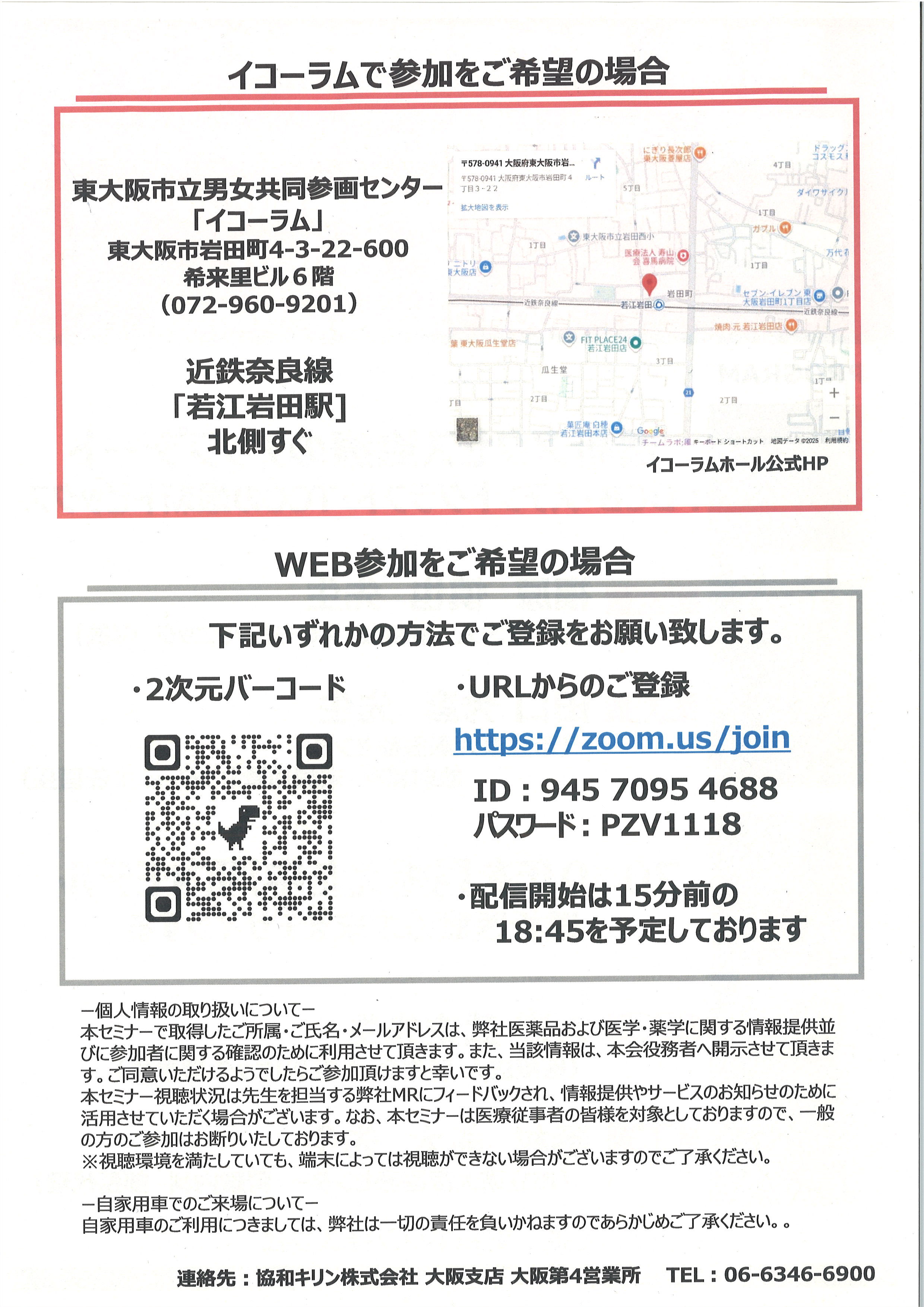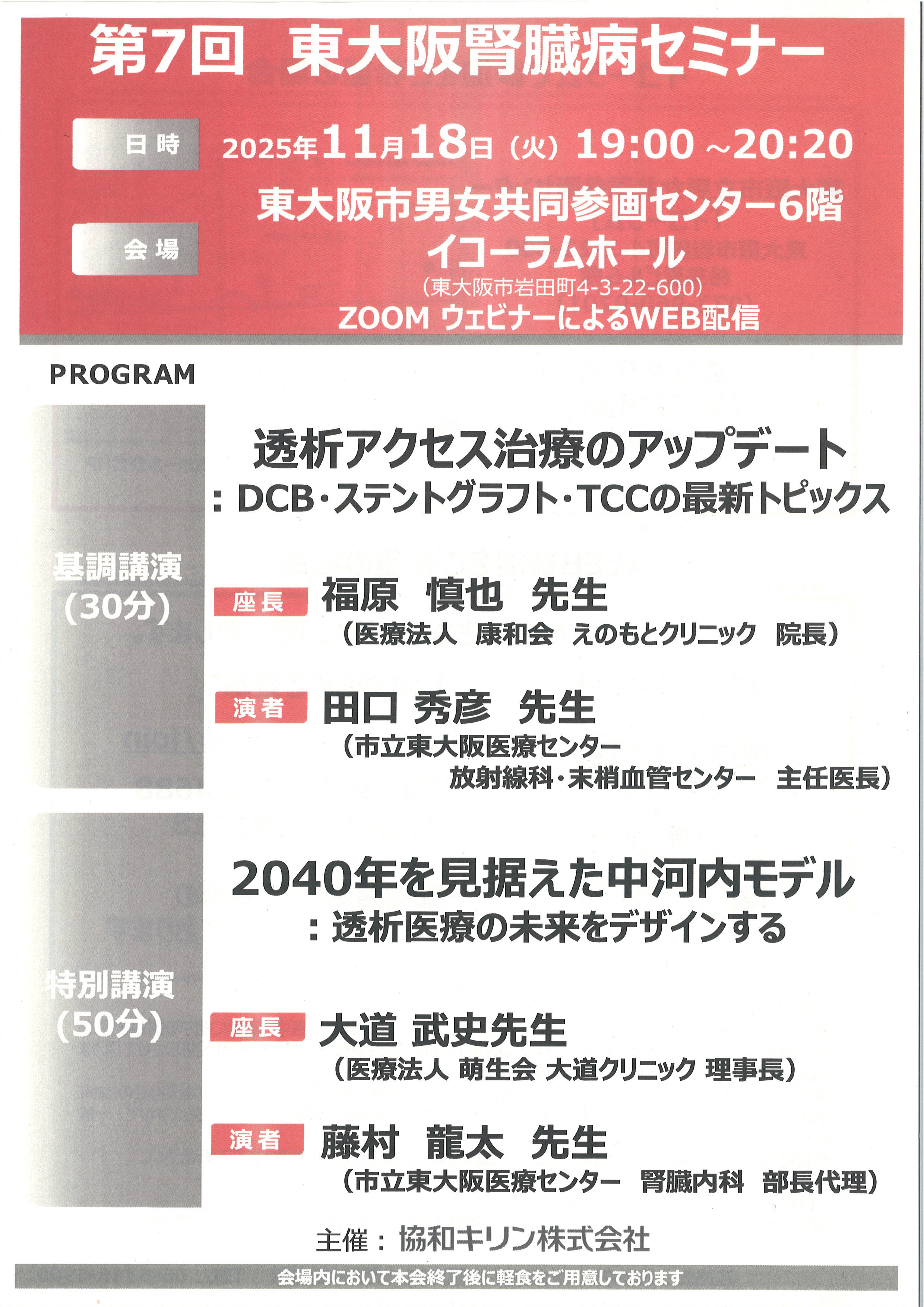 11月18日(土)に東大阪市男女共同参画センター6階 イコーラムホール(若江岩田)において第7回 東大阪腎臓病セミナーが開催されます。ぜひみなさんのお申込みをお待ちしております。