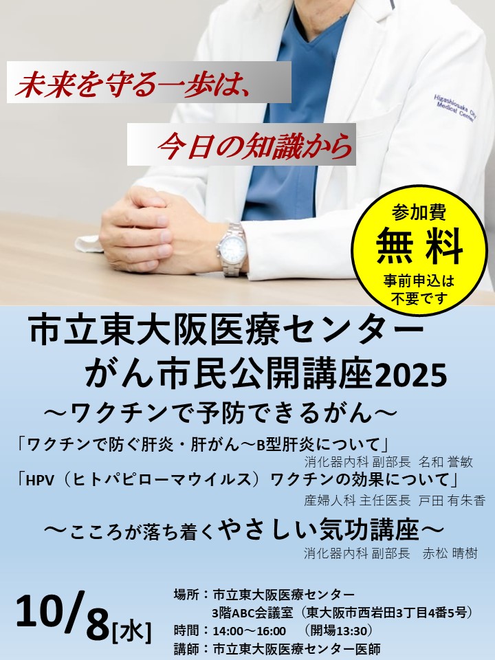 10月8日(水)に当センターにてがん市民公開講座2025が開催されます。ぜひ皆さまのご参加をお待ちしております。