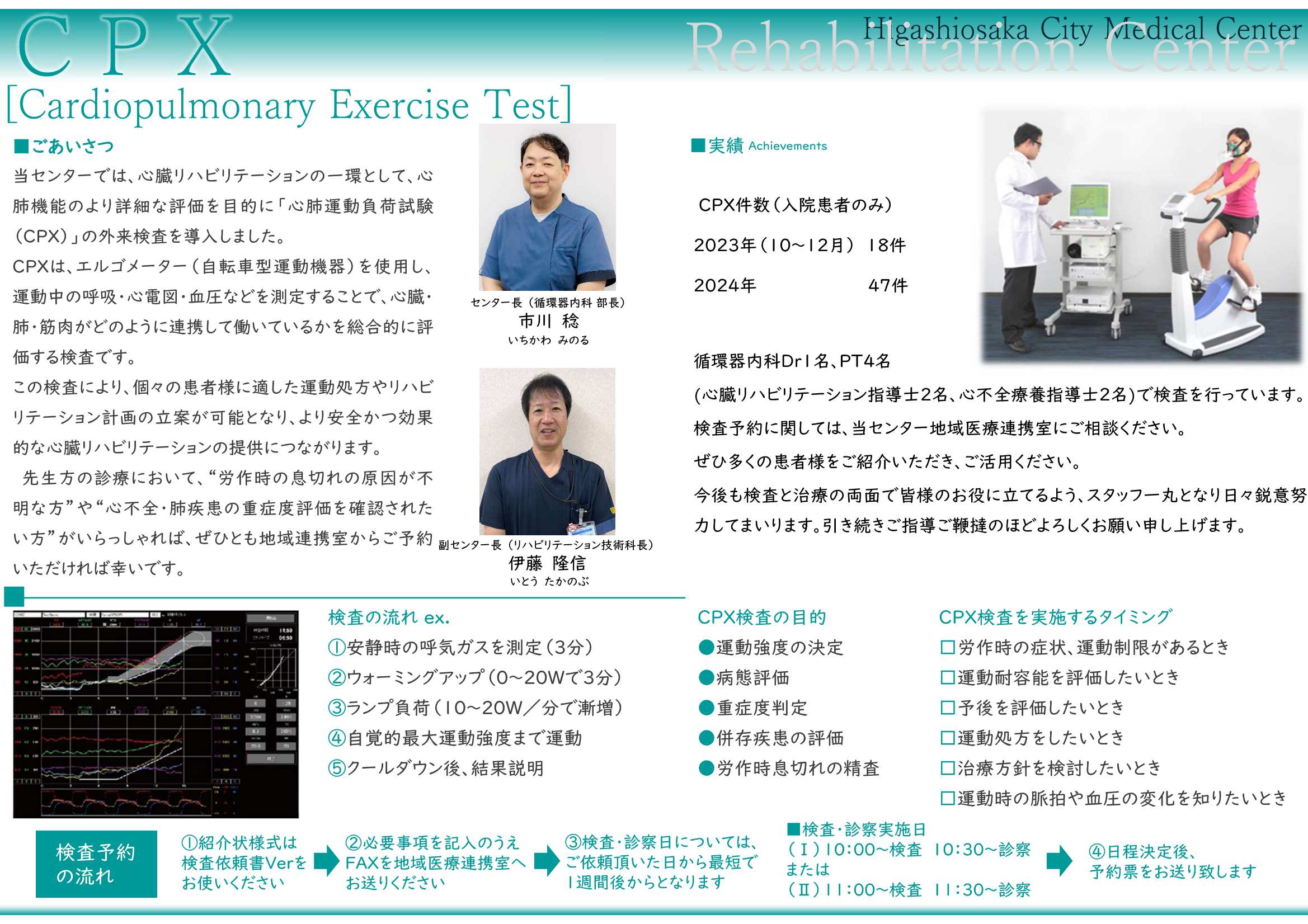 当センターでは、心臓リハビリテーションの一環として、心肺機能のより詳細な評価を目的に「心肺運動負荷試験(CPX)」の外来検査を導入しました。