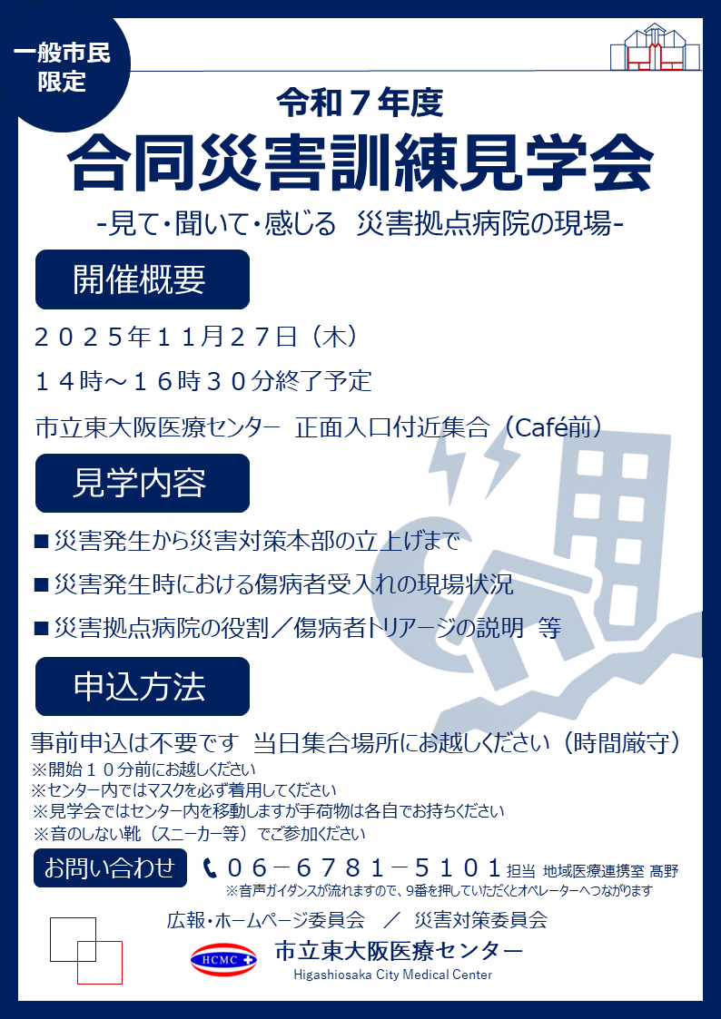 11月27日(木)実施の合同災害訓練の見学会を開催します。 災害拠点病院である当センターの普段見ることのできない現場を ぜひご覧ください。 ※事前の申し込みは不要です。