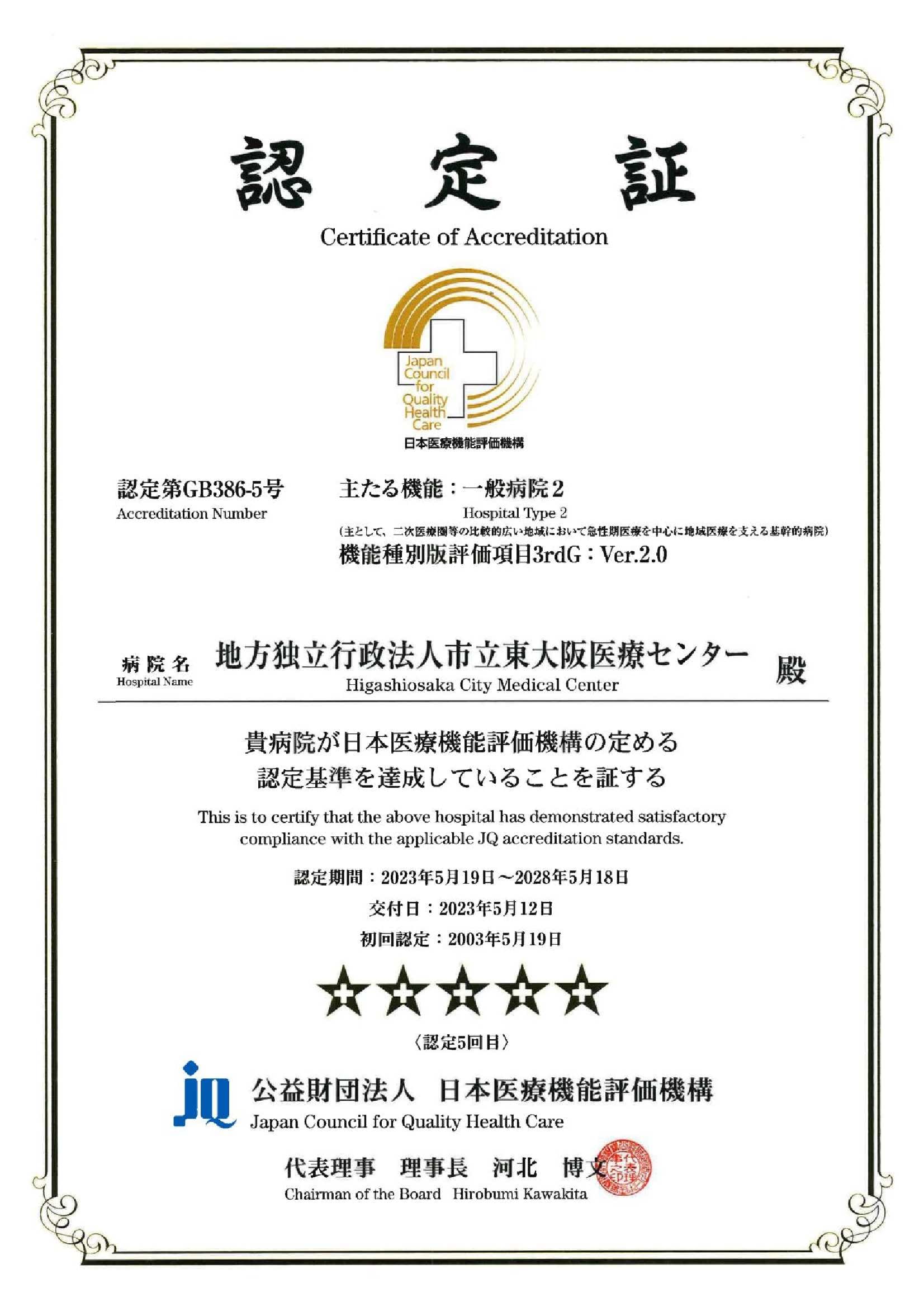 当院は、(公財)日本医療機能評価機構よる病院機能評価(主たる機能:一般病院2<3rdG:Ver.2.0>)の更新審査を受け、2023年5月12日付けで認定されました。