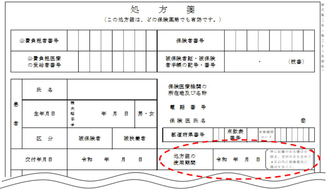 保険医療機関(病院や診療所)で交付される処方箋の使用期間は、交付の日を含めて4日以内です。 これには、休日や祝日が含まれますので、処方箋の使用期間が過ぎないようにご留意ください。 なお、長期の旅行等特殊の事情があり、医師や歯科医師が、処方箋に別途使用期間を記載した場合には、その日まで有効となります。